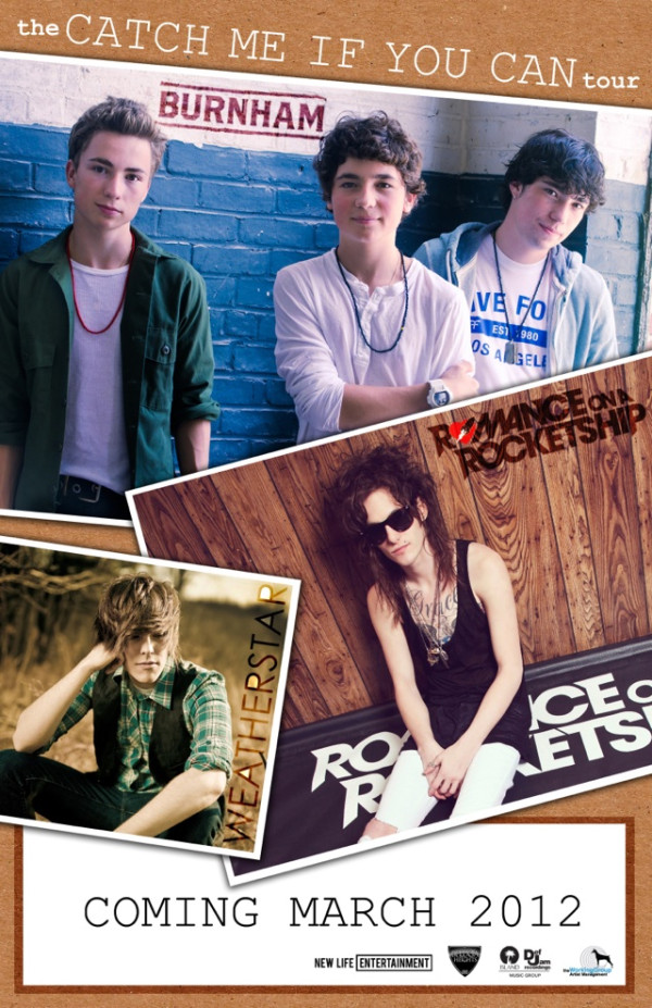 “Catch Me If You Can” because I know you’re probably running around your house right now with excitement!! Why? Because Burnham has just announced their “Catch Me If You Can” tour, that’s why!! Burnham, who has opened up for Justin Bieber on his “My World” tour, tweeted yesterday and wrote, “We ARE GOING ON TOUR!!!! The Catch Me If You Can Tour with @kaseyROAR Romance On A Rocketship and @_WEATHERSTAR_.” Fans of Burnham right away showed their excitement and tweeted Burnham with which show they will be attending. The bands Weatherstar and Romance On A Rocketship will be opening for Burnham.